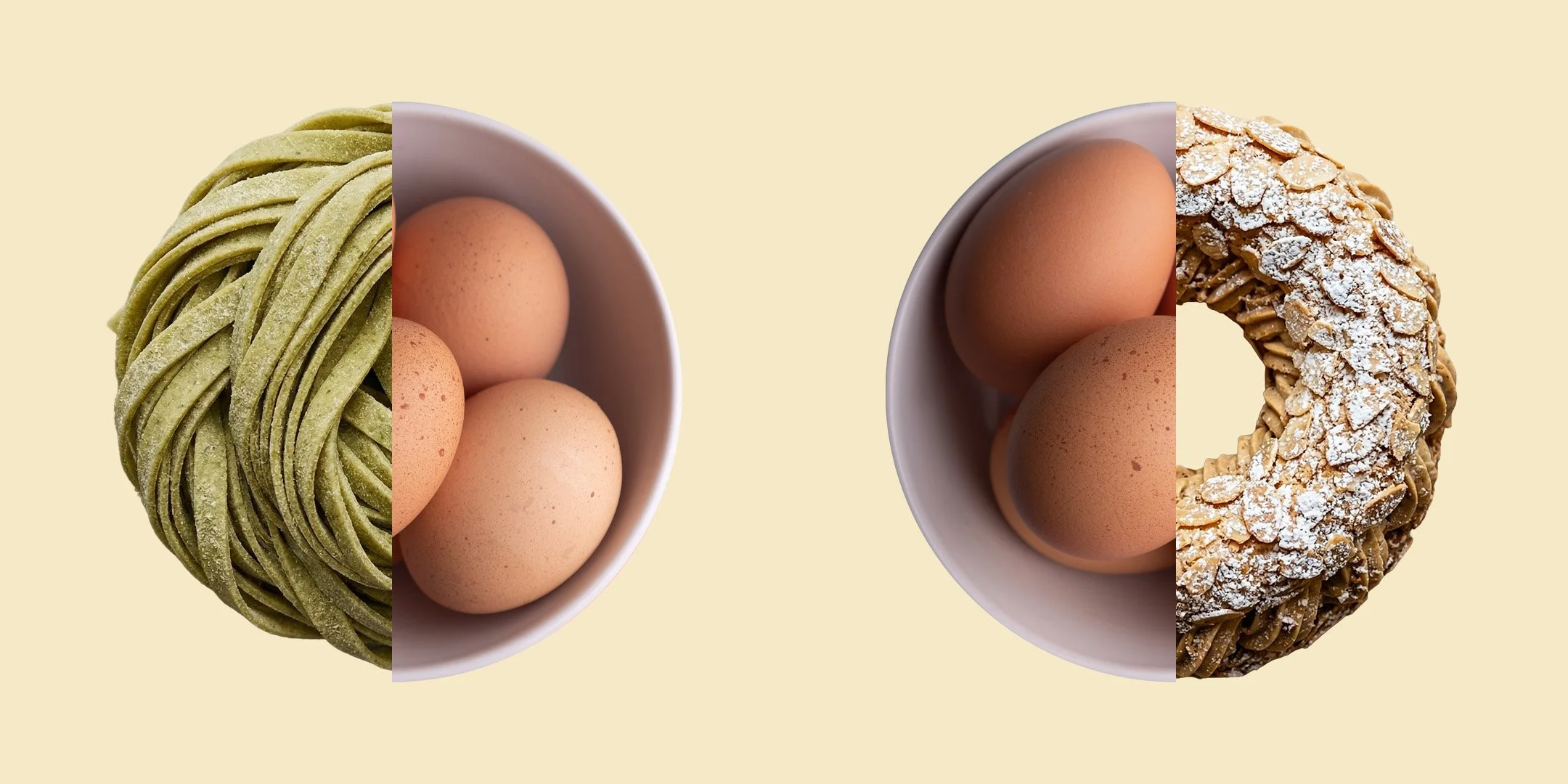 AI generated image: left image half eggs and half bundle fresh pasta knot, and right image with half eggs and half Paris Brest pastry. The composition describes how our fresh eggs transform into finished food forms. Our fresh eggs are a foundational ingredient.