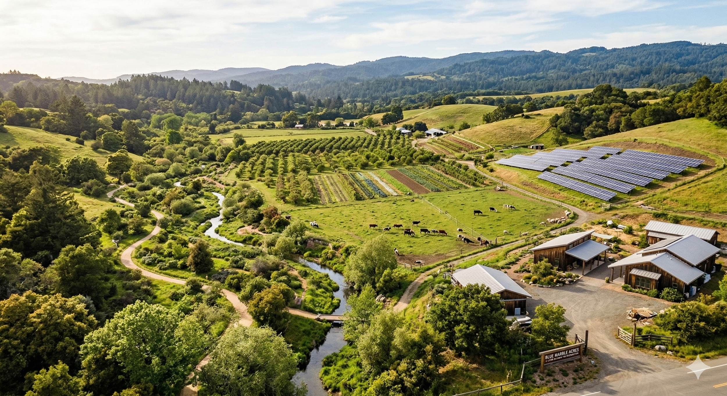 AI-generated image: wide-angle, aerial perspective of Blue Marble Acres, captured in the golden, late-afternoon light characteristic of West Marin. It is designed to look like a functional, high-end "living laboratory" rather than just a traditional farm.
