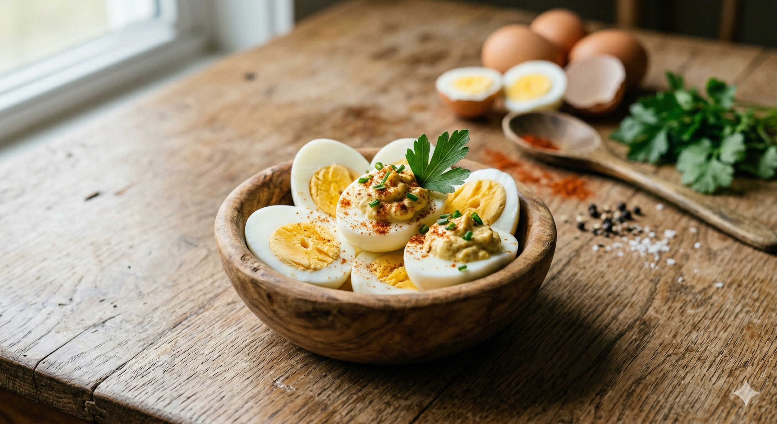 AI generated image of a wooden bowl with hard-boiled eggs filled with deviled mixture recipe feature in this article, sprinkle with paprika, and chives as garnish.